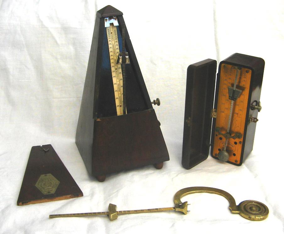 Metronomi da pianoforte. Il primo, inglese, in legno, marchiato Maelzel, risale ai primi decenni del XX secolo ed è di forma piramidale. Il secondo è un piccolo metronomo da viaggio francese, costruito in bachelite a forma di parallelepipedo, nella prima metà del XX secolo dalla ditta Parquet. Il terzo è un metronomo inglese in ottone, costruito nel 1884 e marchiato: PINFOLDS / RE N° 12445 / BREVETE S.G.D.G. sul cursore dei tempi. È costituito da un pendolo basculante su due piedini, con alla base un peso circolare ed, in alto, un’asticella su cui sono incisi i vari tempi: "PRESTO" "ALLEGRO" "ANDANTE" "ADAGIO" "LARGETTO" e "LARGO" mentre sul retro vi sono le varie velocità (da 48 a 144).