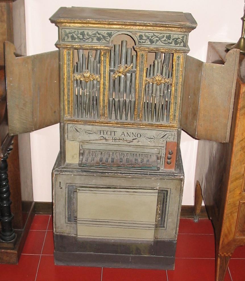 Organo positivo di scuola napoletana costruito nel primo '700 e, forse, restaurato nel 1822 da Michelangelo Colameo. Le dimensioni della parte inferiore sono: L. cm. 58, h. cm. 52, P. cm. 43, mentre le dimensioni della parte superiore sono L. cm. 51,5, h. cm. 65, P. cm. 28. Nella parte superiore ci sono due sportellini che, aperti, mostrano una facciata dal profilo piatto composta da tre piramidi con 7 + 5 + 7 canne di facciata con la più grande posizionata al centro. Le bocche sono allineate nella piramide centrale mentre sono arcuate, con le più alte ai lati, in quelle laterali; sono con mitria segnata a scudo e barba segnata a scudo. Lo strumento è suddiviso in due unità; una contenente la manticeria sulla parte bassa e la seconda contenente il somiere, le meccaniche la tastiera e le canne. Tale strumento è del tipo a trasmissione meccanica sospesa per la tastiera e meccanica per l’inserimento dei registri. Il somiere della tastiera è del tipo a “tiro” con canale a ventilabro orizzontale per nota. La consolle è composta da una tastiera di 25 tasti (Do1 – Do3) in bosso i diatonici ed ebano i cromatici con prima ottava reale. Alla destra della tastiera troviamo la tavola di registrazione con gli appositi pomelli in ottone i quali, tirandoli verso l’esterno, inseriscono i registri. La disposizione fonica dispone di tre registri: Vigesimaseconda (1/2 piede), Vigesimanona e Trigesimaterza (ritornello al II Sol diesis). Le canne sono realizzate in lega di piombo stagno, tutte sono labiali ed hanno forma cilindrica. L’apparato della manticeria è costituito da due mantici a cuneo azionati da due corde che fuoriescono dai due fori laterali. La firma del costruttore è apposta tra la parte interna della tastiera e la catenacciatura. Il diapason è di 417 Hz, tipico degli strumenti napoletani del primo ottocento. Le dimensioni ridotte fanno pensare ad un organo da processione.