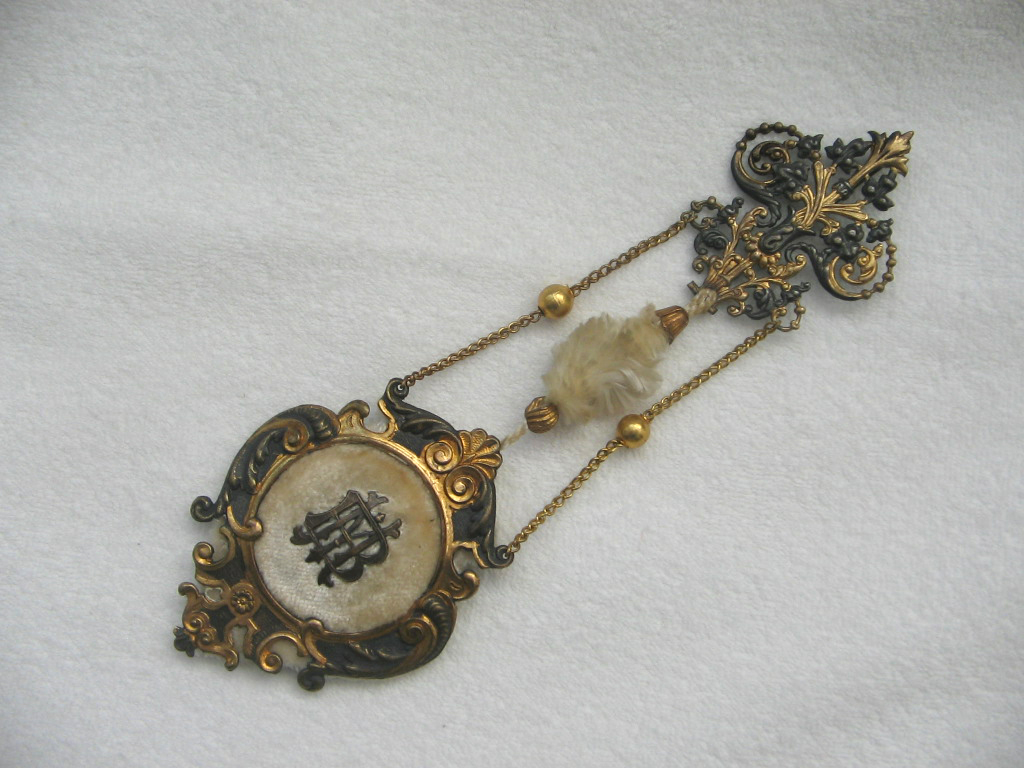 Carnet da ballo praghese, in metallo dorato e argentato, che veniva tenuto al poso delle dame e serviva a segnare l’ordine dei cavalieri per i balli. È costituito da un gancio superiore con un ricchissimo fregio, tre catenelle con palline dorate e una piuma e un medaglione inferiore con, sul fronte le iniziali sovrapposte M B e sul retro la data: 24. LEDNA (gennaio) 1893 su di un piccolo taccuino con una matita con la testa di avorio.