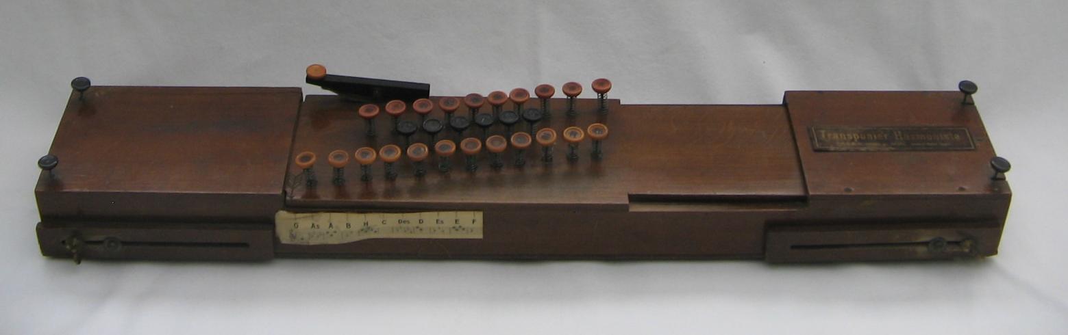 Transponier-Harmonista. L’harmonista è un dispositivo che permette di produrre armonie complete premendo un solo pulsante, può essere stabilmente alloggiato sulla tastiera di un organo o mobile. L’aggettivo transponier indica il dispositivo mobile che viene fatto scorrere in modo da essere impostato su posizioni diverse sulla tastiera. Due furono i principali costruttori di questi dispositivi, Ernst Erich Liebmann e Emil Müller. Questo strumento è stato costruito nel 1908 da Emil Müller, costruttore di organi a canne a Werdau e armonista adottati da numerose marche di organi, attivo dal 1887 al 1945. Sulla targhetta si legge: Transponier - Harmonista / D.R.G.M. No. 364901. No. 364902 Ausland-Patent angem. Ogni pulsante attiva quattro cilindretti di legno che abbassano i tasti (quando il repere è posizionato sul Do il primo tasto abbassa le note Do, Mi, Sol, Do producendo l’accordo di Do Magg. e così via di seguito). Sulla parte superiore vi sono ventotto tasti (dodici chiari, sei scuri e dieci chiari) che danno la possibilità di eseguire altrettanti accordi. Le dimensioni sono mm.730 x 127 x 73, sulla faccia posteriore vi sono due distanziatori mentre su quella anteriore vi sono due fermi con vite a farfalla per bloccarlo sulla tastiera, la freccia di posizionamento e una striscia di carta con l’indicazione degli accordi.