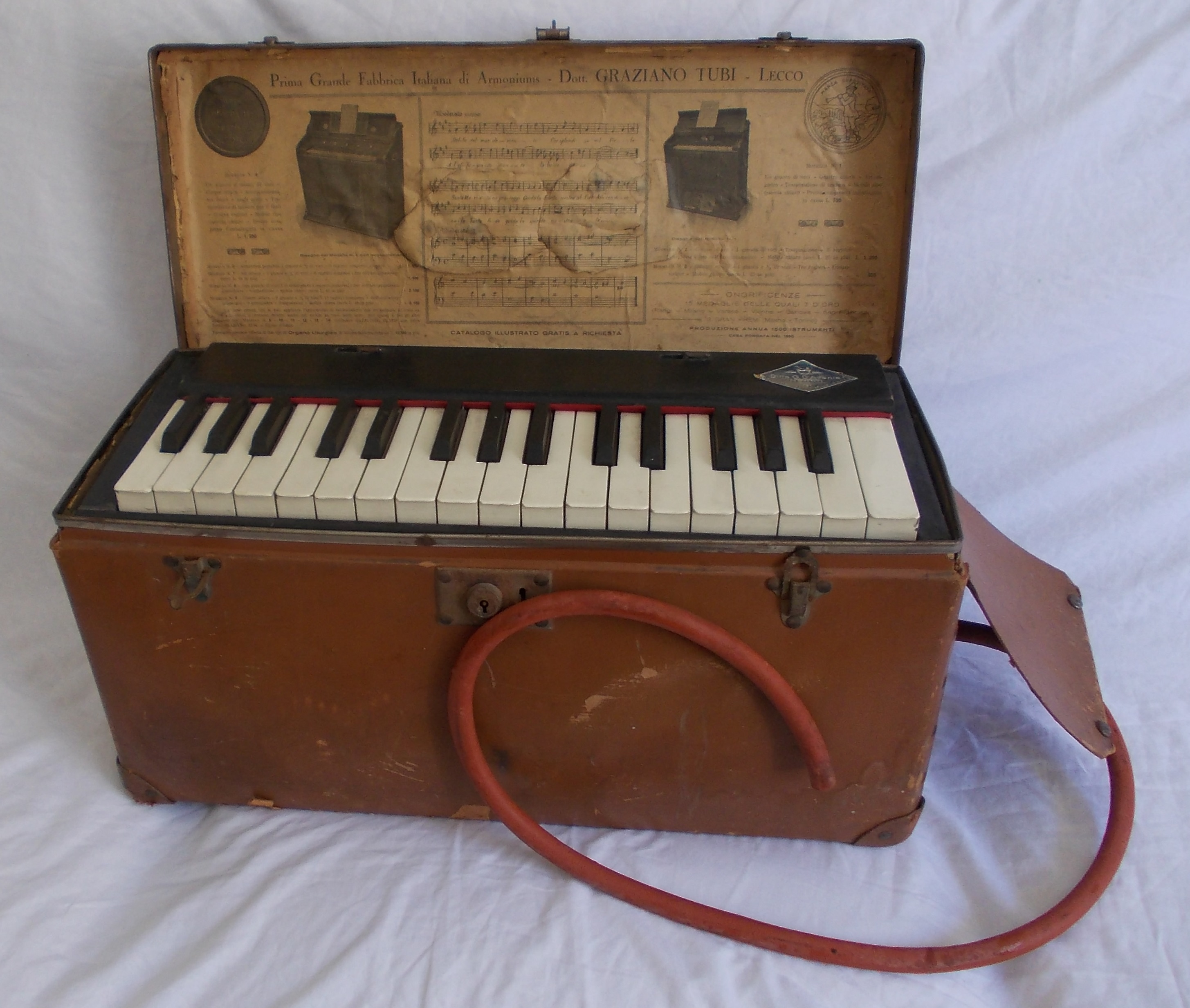 Armonium portativo (guida voce) italiano prodotto dalla celebre ditta dott. Graziano Tubi di Lecco e commercializzata dalla ditta Giovanni D’Avenia di Napoli, fabbricanti di pianoforti dal 1860, con sede in via S. Sebastiano 40. Graziano Tubi (Milano 1825 – Lecco 1904) fu un eclettico imprenditore lombardo che fondò l’omonima fabbrica di armonium nel 1860 a Milano e nel 1868 la trasferì a Lecco. Egli, intorno al 1870, ricordando l’invenzione di questo strumento scrisse: Lo studio della musica e il desiderio di possedere un istrumento a tastiera completo e portatile, mi condusse all’invenzione di un armonium portatile applicabile al pianoforte, e quella invenzione mi condusse a stabilire il Italia una fabbrica di armonium, che io stesso dirigo, e che produce attualmente un istrumento completo al giorno….. Lo strumento è contenuto nella custodia originale di cartone pressato e metallo con apertura laterale per inserire il tubo di insufflazione delle dimensioni di mm. 215 x 265 x 515. All’interno del coperchio vi è una pubblicità cartacea della produzione della ditta Tubi con il marchio del suonatore di zampogna circondato da tre pecore. L’estensione va dal Fa3 al Do6 e il suono è prodotto dal fiato insufflato nei mantici attraverso un tubo di gomma. Lo strumento risale agli ultimi decenni del XIX secolo.