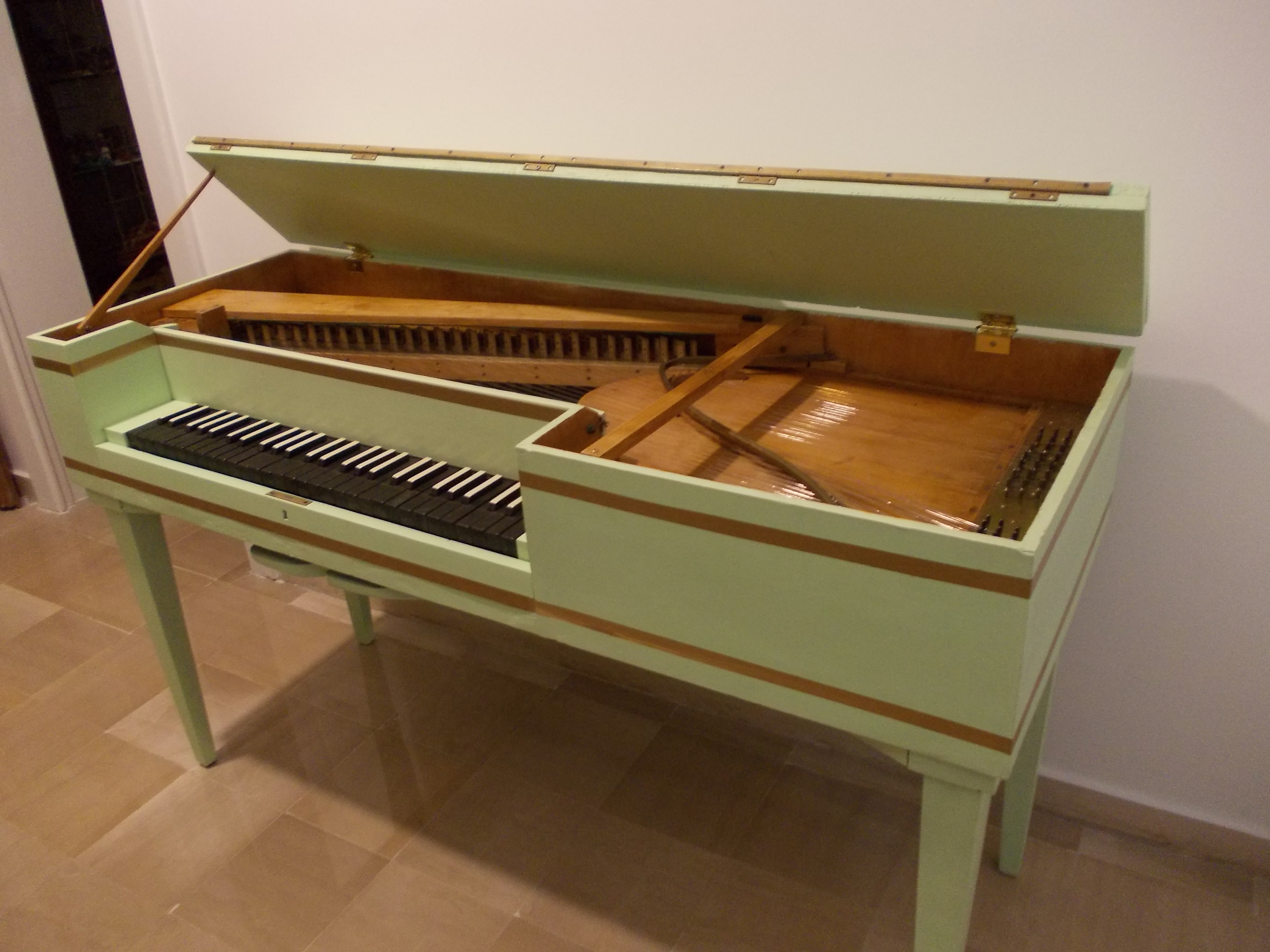 Spinetta, anonima, tipo arpicordo (secondo la definizione di J. H. van der Meer e Tagliavini) rettangolare. Il somiere di abete, posto sul lato corto destro, su un unico blocco di legno sormontato da una lamina di ottone, mostra due gruppi di caviglie per le note acute e quelle gravi. Le corde passano sul ponticello del somiere piegato a gomito, scorrono quasi perpendicolarmente alle leve dei tasti, superano il ponticello a “elle” presso l’attacco e si attaccano lungo il fondo dello strumento. I salterelli, disposti in maniera quasi parallela agli attacchi, pizzicano le corde, tese per gruppi due, uno verso l’esecutore e il successivo verso il fondo. Piccolo vano per gli utensili a sinistra. Tavola senza rosetta. Provenienza arco alpino e databile alla prima metà del XIX secolo. La tastiera, rientrante e decentrata sulla sinistra dello strumento, è dotata di 54 tasti (Do0 – Fa4) con i tasti ricoperti di lamine di ebano e quelli cromatici di osso bianco. Per ogni tasto vi è una sola corda in acciaio armonico e i salterelli hanno penne in ottone. Sui supporti delle tangenti vi è una stretta e lunga assicella smorzatrice. Sotto lo strumento ci sono due meccaniche, azionate con la parte superiore delle ginocchia, di cui solo la destra funzionante e che agisce sugli smorzi. Il colore e il fregio in oro non sono originali ma si avvicinano molto ai residui di vernice originale. Le dimensioni dello strumento sono mm. 1489 x 548 x 315 x mentre le gambe, a sezione quadrangolare e lievemente rastremate, sono alte mm. 577.