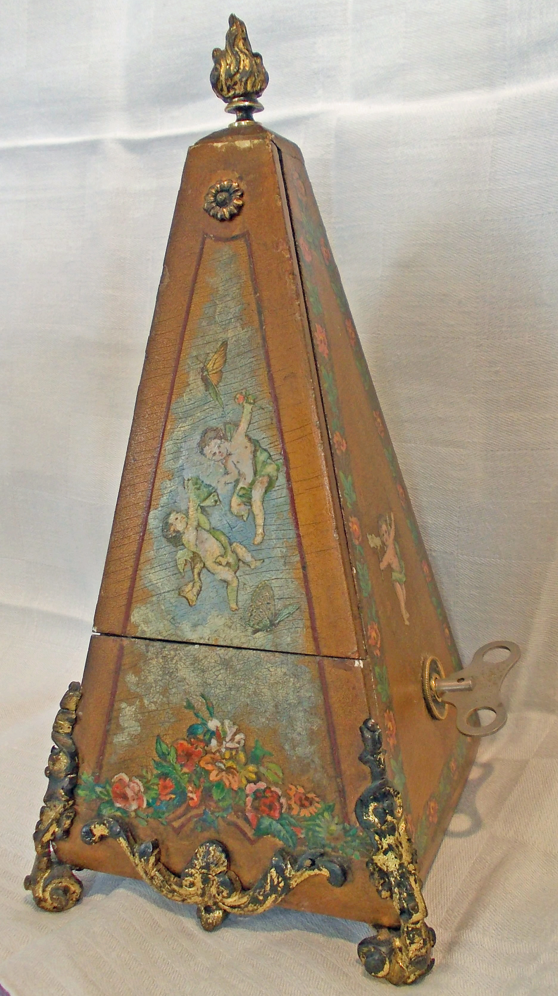 Metronomo francese sul modello di Johann Nepomuk Mälzel, databile intorno al 1830. È costituito da una custodia di legno a forma di piramide quadrangolare, con base di mm. 110 e altezza 262, che poggia su due piedini anteriori e uno posteriore. Tutti i lati sono decorati da immagini di putti e fiori, i piedini, la fiamma che sovrasta lo strumento e la parte inferiore allo sportellino sono in bronzo dorato e riccamente decorati. Se si apre lo sportello anteriore si rende visibile, una scala graduata che permette la corrispondenza tra i diversi tempi musicali e il numero di oscillazioni di un pendolo in ferro, munito di tacche trasversali, lungo il quale scorre un cavaliere la cui posizione permette di regolare la scansione del tempo. Il funzionamento dello strumento, attivato da una carica a molla con la chiave posta sul lato destro, si basa su un meccanismo ad orologeria regolato da uno scappamento comandato dal pendolo, il cui periodo è variabile entro un intervallo definito. L’etichetta interna recita: METRONOME DI MAËLZEL / Par J,, WAGNER Neveu / Meccanicien Horologer / Rue Mountmartre N° 118 a Paris / advant rue du Cardian N° 39 / N°…… / Signature de M? Wagner (firma autografa). Il famoso orologiaio Wagner Jean Neveu (Pfalzel 1800, Parigi 1875) arriva a Parigi all'età di 12 anni e fu allievo di suo zio e suo cugino Bernard-Henri Wagner, vivendo nella loro casa a rue Montmartre. Successivamente sposta la sua bottega di orologiaio in Rue Neuve des Petit Champs 47 e infine in rue du Cadran 39, presso lo stesso indirizzo di suo cugino.