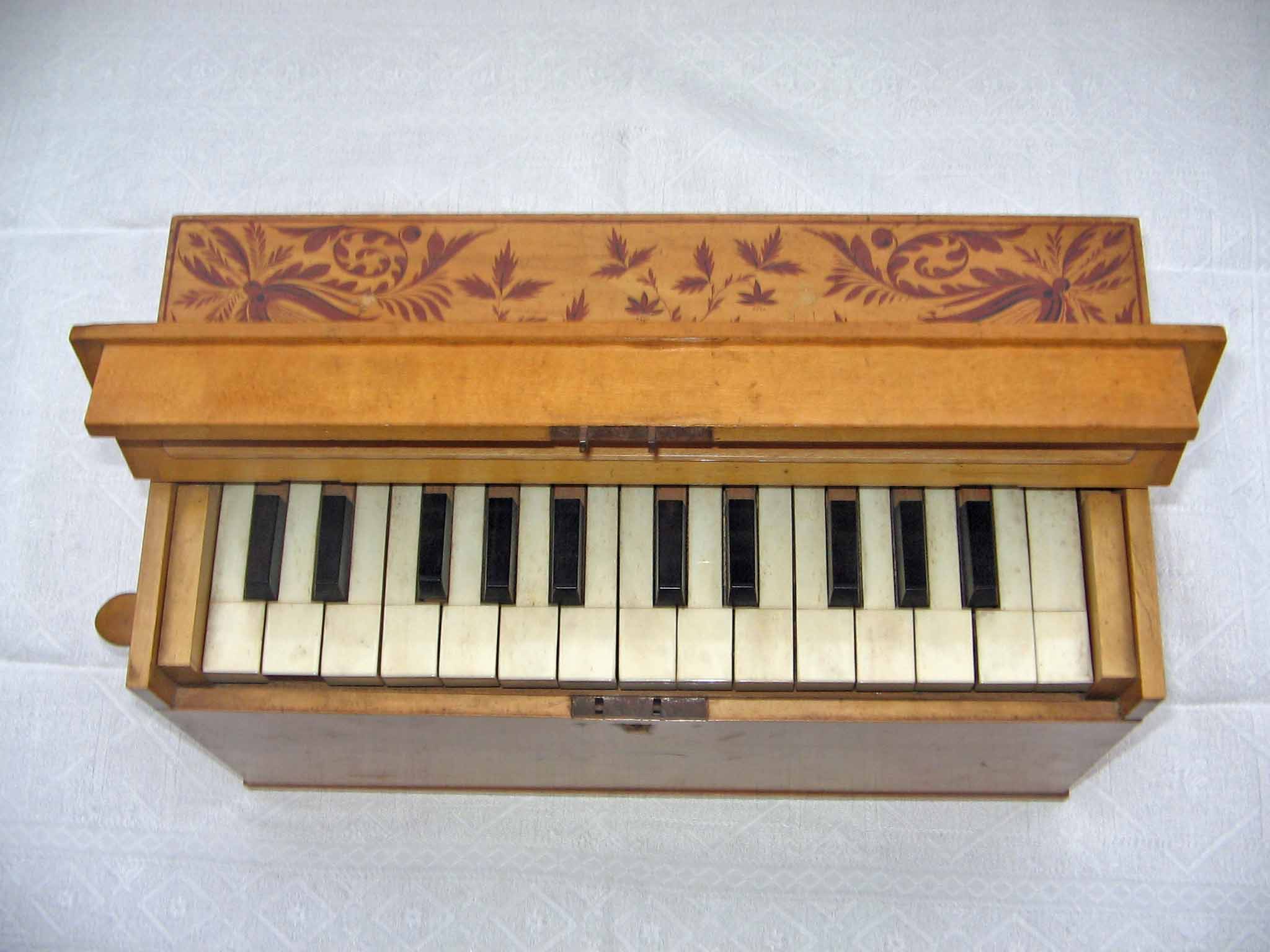 Flutina (Harmoniflüte) anonima. Prima metà del XX secolo, probabilmente indiana. Questo strumento è un piccolo armonium ad ancie libere il cui mantice, posto posteriormente, veniva azionato con la mano sinistra mentre la destra si muoveva sulla tastiera. L'estensione è dal Do2 al Re4, i tasti cromatici sono in ebano mentre i diatonici sono placcati in madreperla. La scatola, in abete, misura, a soffietto chiuso, 55 x 29 cm, h 25 cm. Questi strumenti nacquero in Francia ma attualmente sono molto diffusi in India e Pakistan.