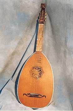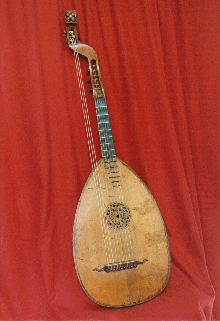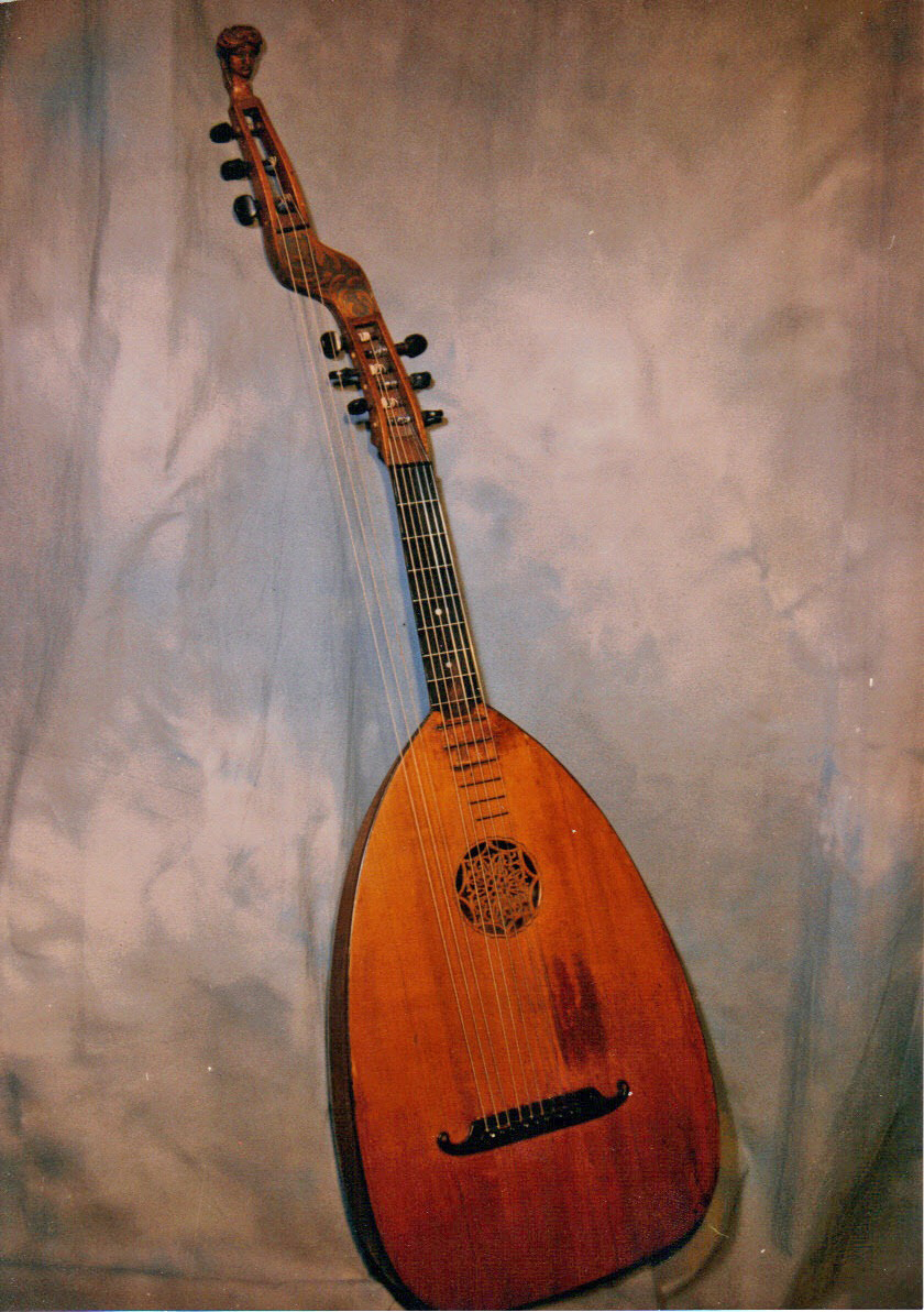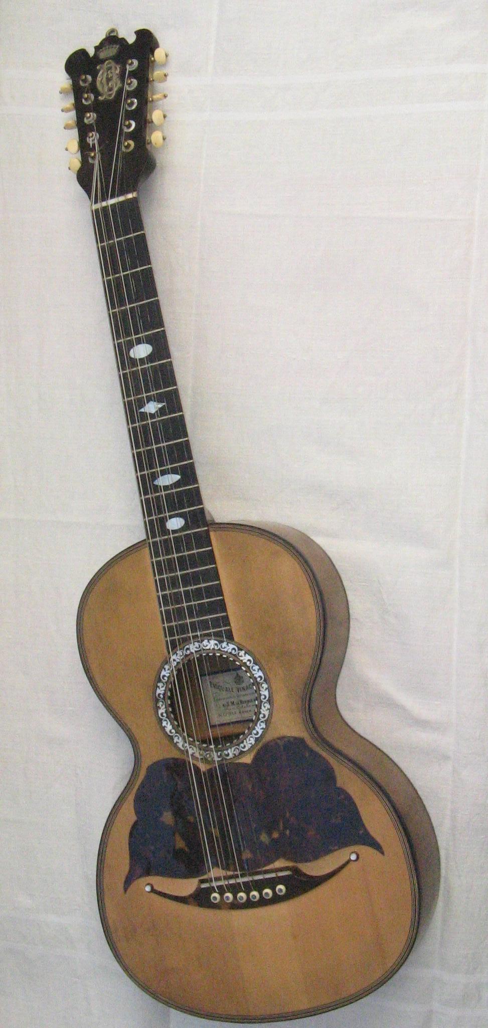 Liuto-chitarra con bordoni Norimberga, Germania, liutaio August Schultz fabbricato il 14.7.1909 per il sig. Carl Wallendo, cantante di opera a Kiel, 2° cavigliere in legno scolpito con testa femminile, manico in palissandro, ponticello e tastiera in ebano, tasti del tipo ondulato-scavato, 11 doghe in acero, tavola in abete. Per notizie sui liuti collegati al sito