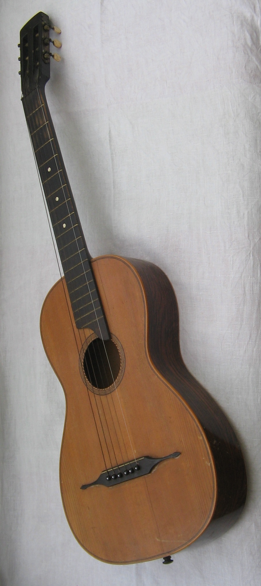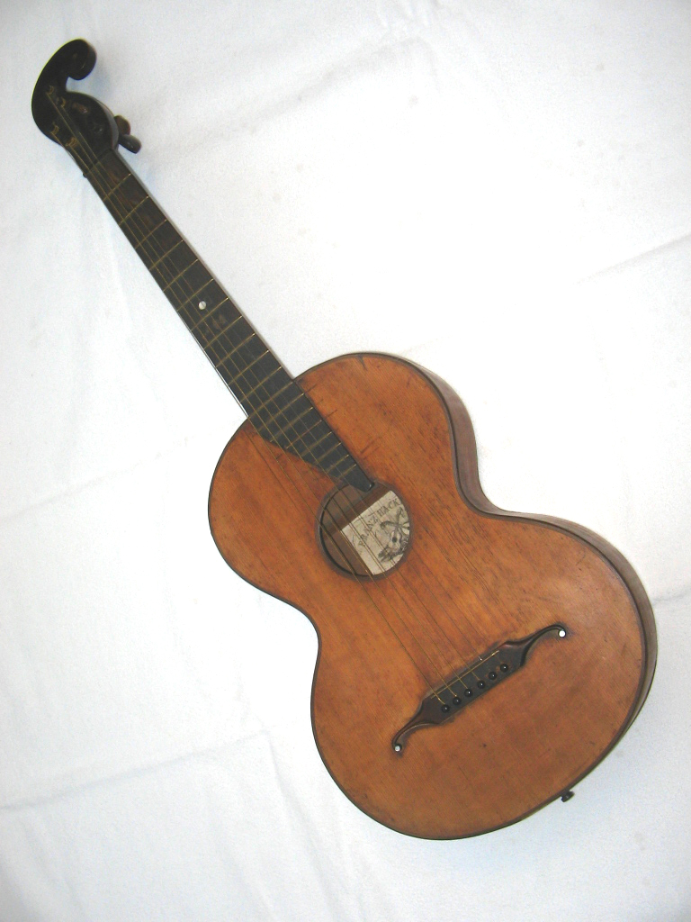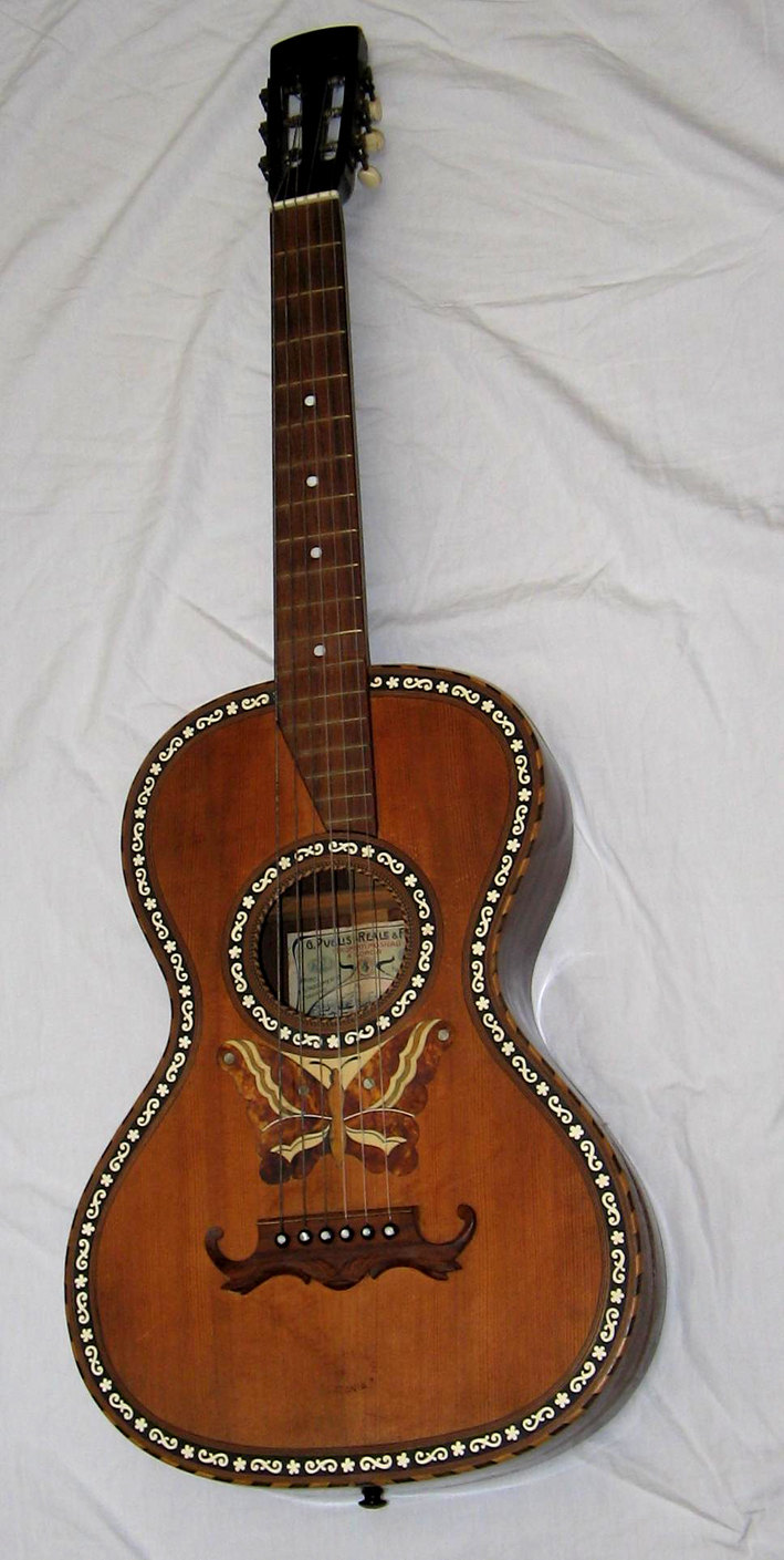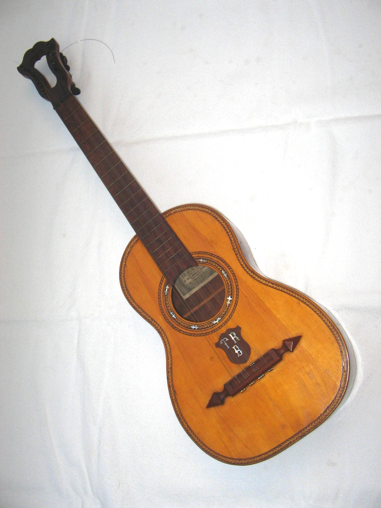 Chitarra anonima, costruita da un liutaio esperto tra il secondo ed il terzo decennio del XX secolo. Lo strumento ha il fondo, in due parti, e le fasce in palissandro, la tavola in abete di ottima qualità con venature regolari e fitte contornate da una triplice filettatura bianca, il ponticello è successivo. La buca è contornata da due triplici filettature in legno scuro in mezzo ai quali vi è un bel fregio in madreperla. Le meccaniche hanno farfalle in osso mentre il manico è in noce e presenta 17 tasti che, sulla tavola, sono presenti solo per le corde acute.