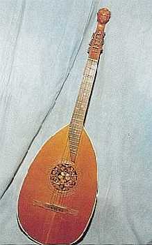 Chitarra-liuto, tedesca, anonima, della prima metà del XX secolo. Questo strumento ha il manico della chitarra e la cassa spiccatamente piriforme come quella del liuto. La tavola è in abete con una filettatura in avorite, la buca presenta un ricco rosone intagliato a forma di tralci e foglie di vite ed il guscio è formato da 11 doghe di acero con vernice chiara. La cassetta delle meccaniche è lunga e stretta e termina con una testa muliebre. La tastiera, in palissandro, presenta 17 tasti metallici.