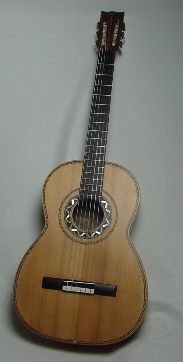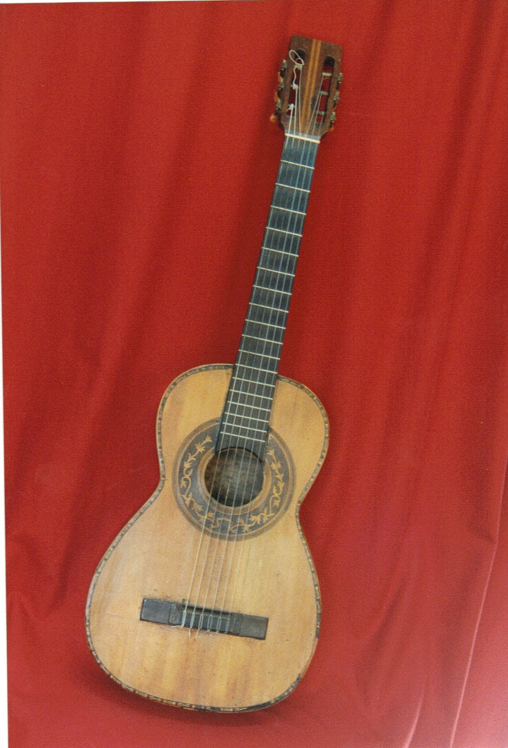 Chitarra spagnola a sei corde costruita nella seconda metà del XIX secolo ed importata in Italia, infatti il cartiglio interno reca l'indicazione degli importatori Maccolini-Viscardo di Milano. La bella fattura dello strumento e le dimensioni lievemente ridotte possono farla attribuire a Torres o Pages, le meccaniche sono a farfalla tipo Aguado. Lo strumento ha una tavola in abete ed un ricco decoro floreale intorno alla buca, fondo e fasce in acero. La tastiera, in ebano, è l'unica parte non originale in quanto restaurata dal liutaio Pio Montanari di Genova.