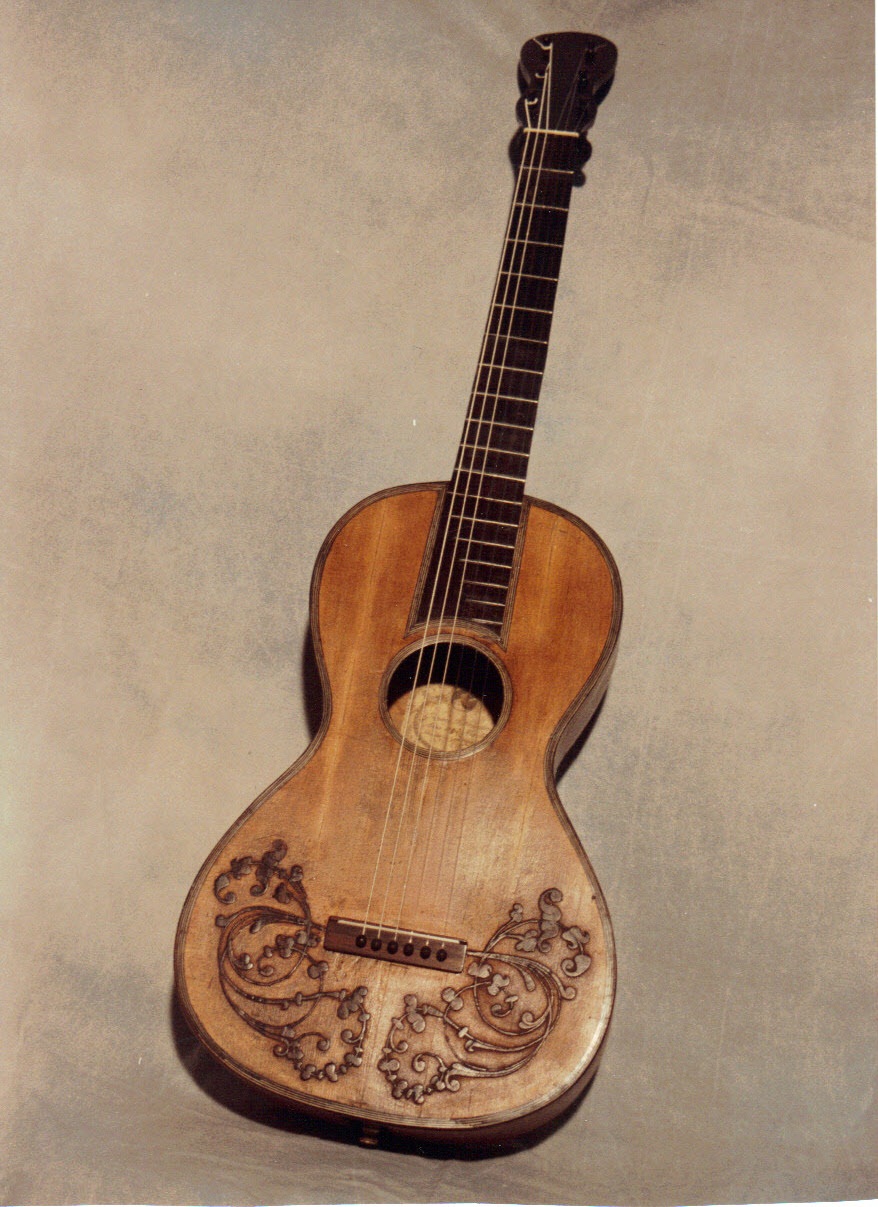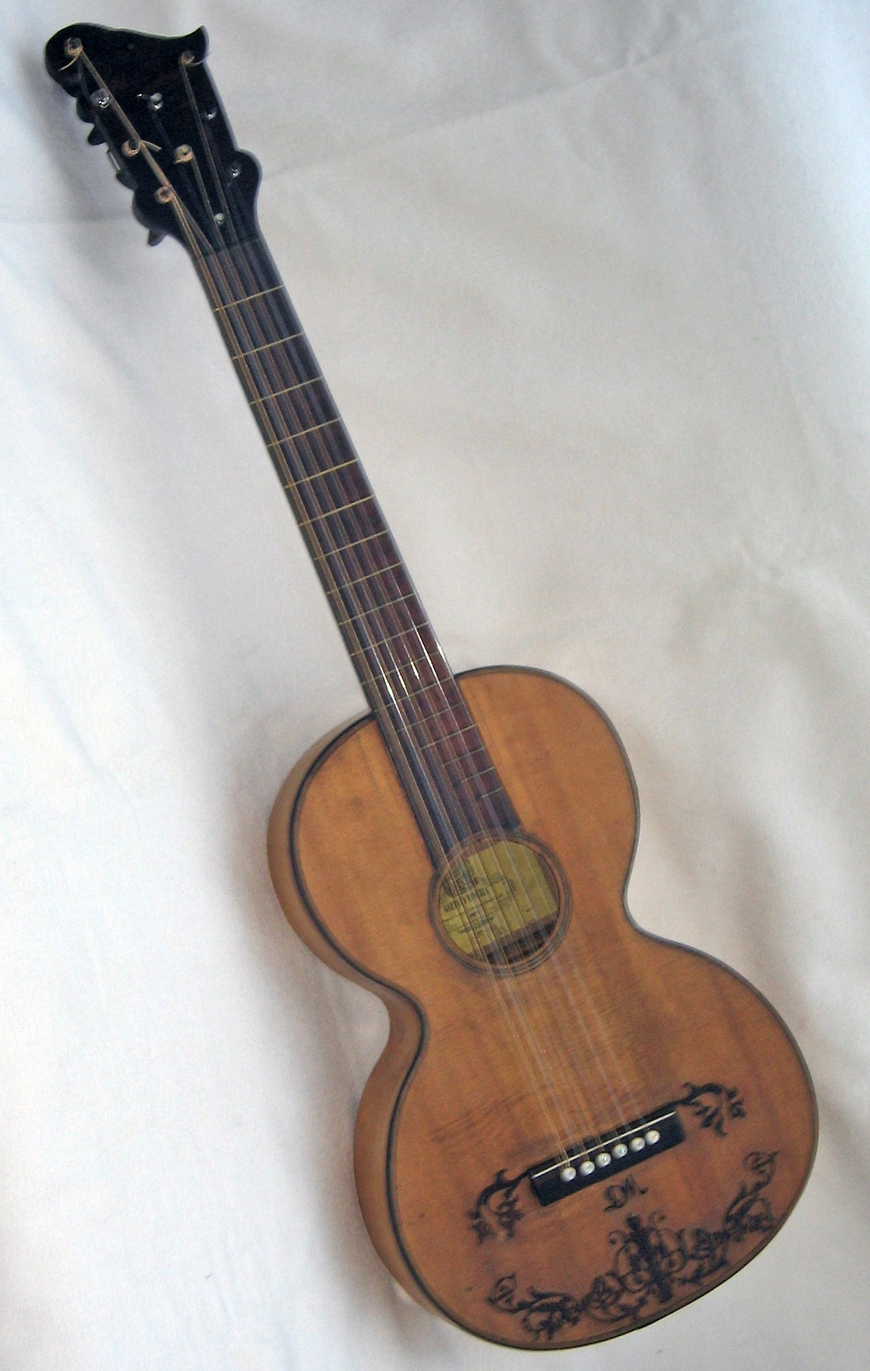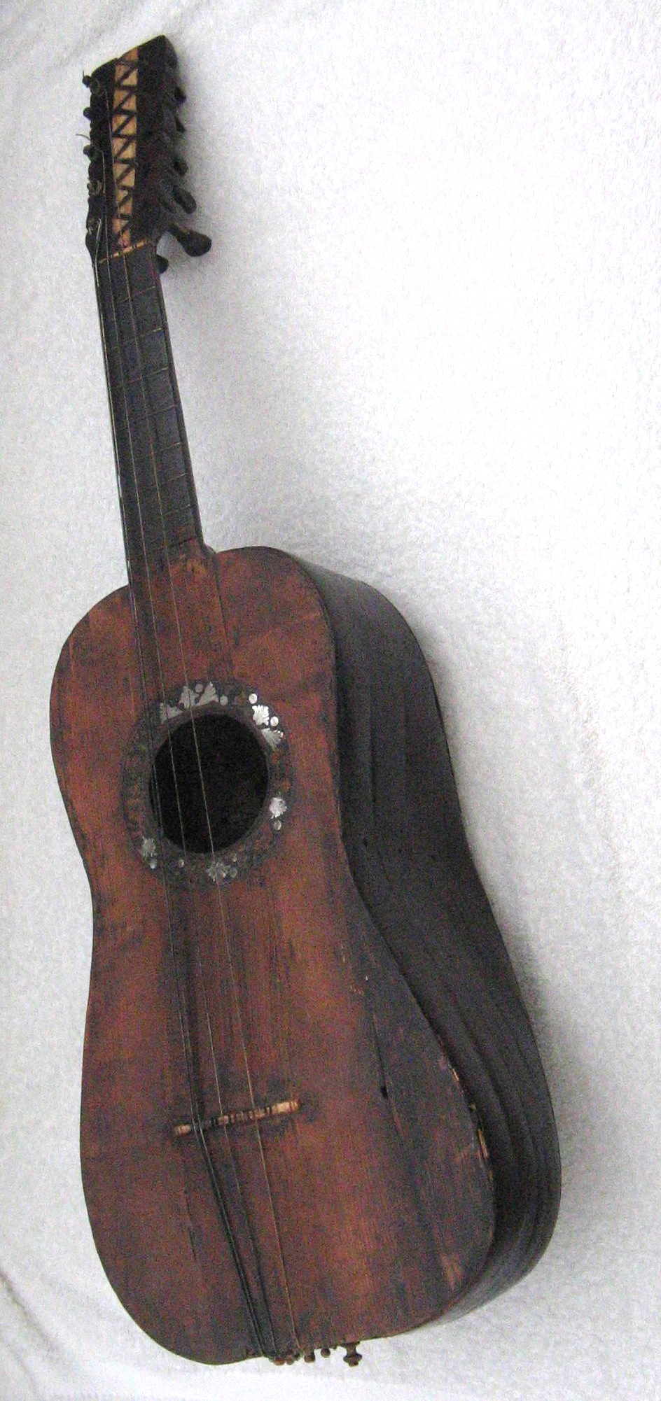 Chitarra francese, fabbricata probabilmente dalla liuteria Mirecourt, attiva a Parigi dal 1780 al 1820. Lo strumento, ha la tavola in un unico pezzo di abete, con filettature in ebano, 5 intorno alla buca e 3 sul contorno. Il fondo, in due parti, e le fasce sono in acero, la tastiera, la paletta ed i piroli in ebano ed il manico in noce. La paletta ad 8 è innestata a V sul manico. La tavola armonica prosegue sul manico e presenta 6 tasti metallici mentre la tastiera, sullo stesso piano della tavola, ne presenta 11. In avorio sono 3 bottoni per la cinghia, il fondo del tacco, la parte superiore del ponticello e dei piroli i quali presentano sulla testa una decorazione in madreperla. Per