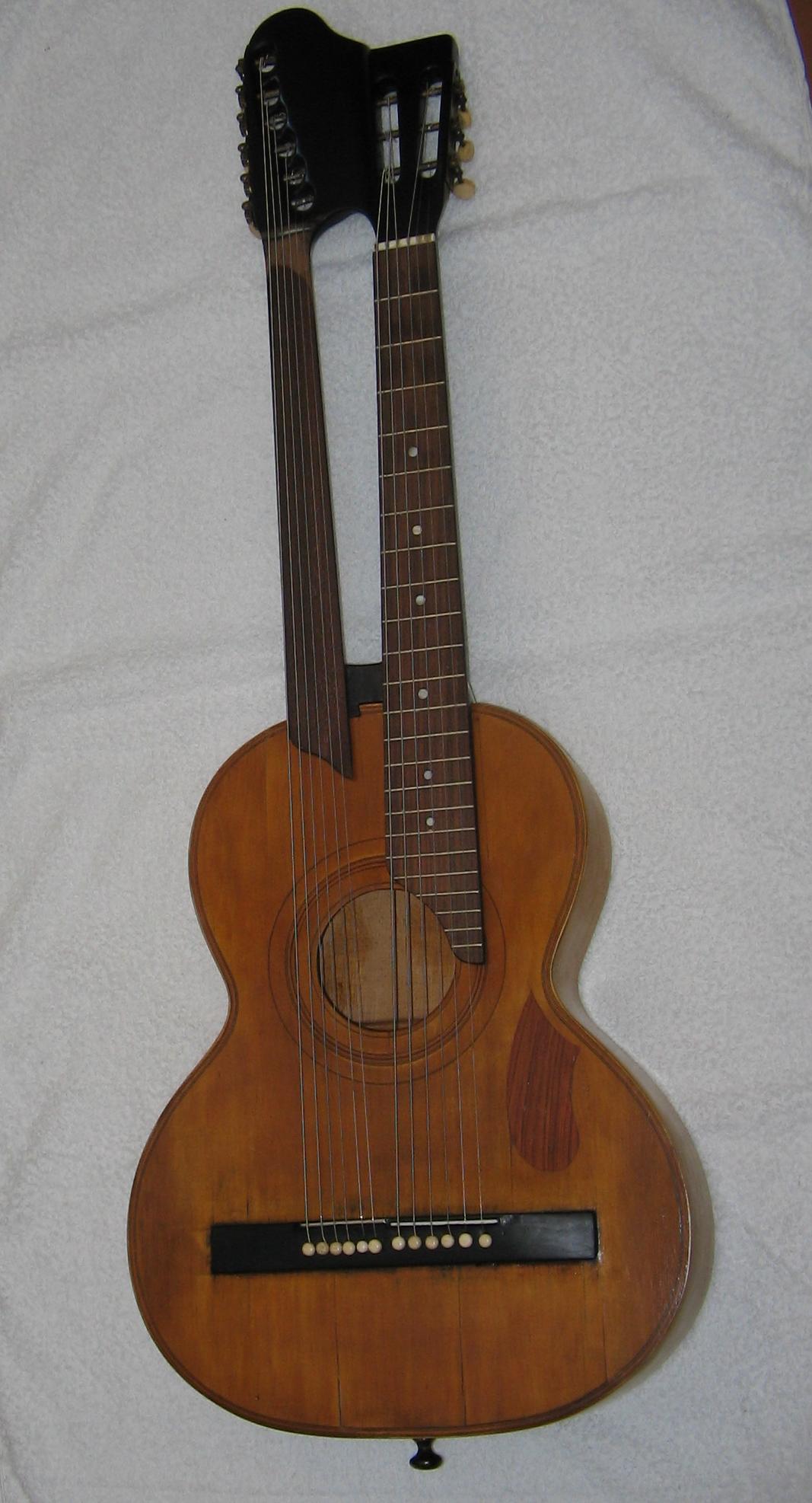 Chitarra a due manici (kontragitarre), anonima, costruita in Germania o in Austria nei primi decenni del XX secolo. Lo strumento presenta un manico normale a sei corde ed una supplementare con altre sei corde non tastabili. Il piano armonico, in abete, presenta alcune fratture ben restaurate, il ponticello è di restauro, ed il battipenna probabilmente non è originale. Il fondo e le fasce sono in acero, I manici sono in legno dipinto di nero, con ventitré tasti e sono regolabili tramite una vite posta sulla cassa dello strumento e le meccaniche a farfalla. Dimensioni: lunghezza totale 100 mm.; lunghezza cassa mm 457; lunghezza manico mm 505; lunghezza manico supplementare mm 535; larghezza cassa parte sup. mm 264; larghezza cassa parte inf. mm 359; larghezza cassa alle rientranze mm 201 ; altezza fasce mm 73, mm 93; lunghezza vibrante mm 647; diametro buca mm 89.