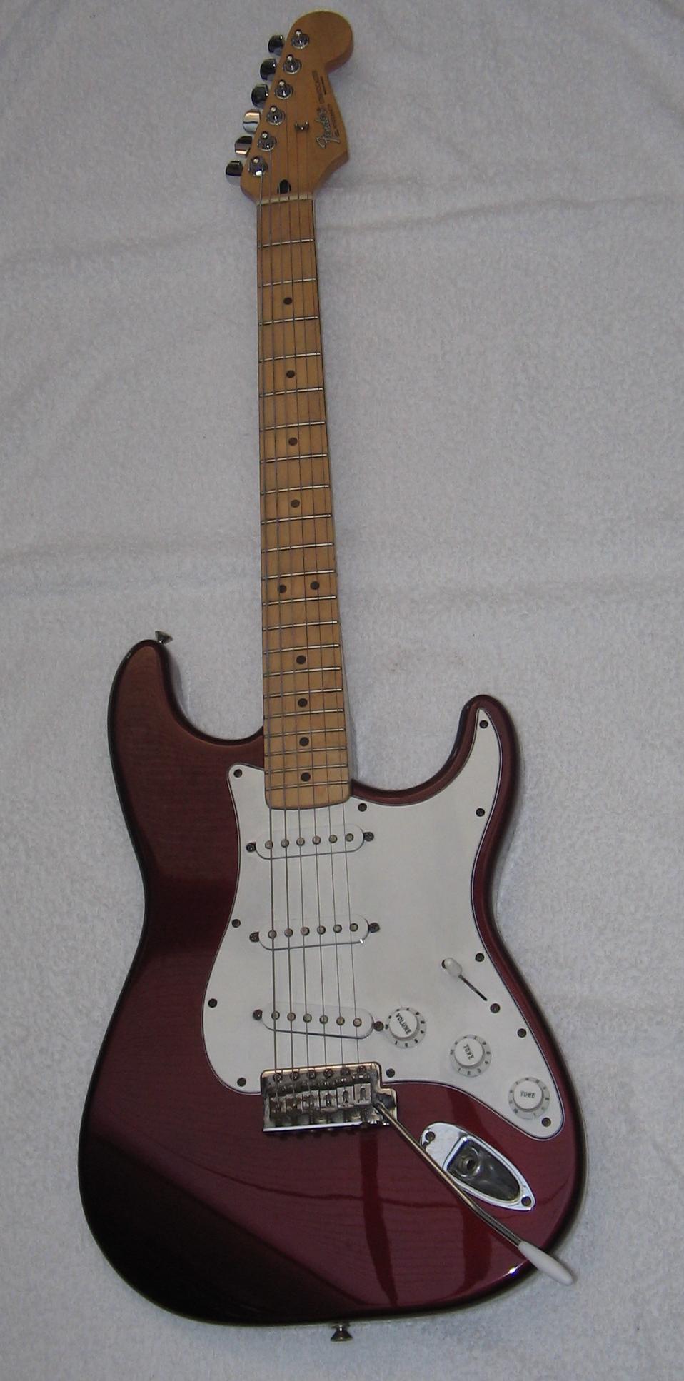 Chitarra elettrica Fender tipo Stratocaster, numero di serie MN8309477, costruita nell’ultimo decennio del ‘900. Lo strumento è in acero verniciato di rosso cupo con battipenna bianco. Manico e paletta in un unico pezzo di acero chiaro con meccaniche tutte sulla parte sinistra del cavigliere e 21 tasti metallici. Sulla faccia anteriore della cassa sono presenti tre manopole (volume e due toni), la leva di comando per i pick-up, tre pick-up e la presa per l’amplificatore. Dimensioni: lunghezza totale mm 981; lunghezza cassa mm 401; lunghezza manico e cavigliere mm 580; larghezza cassa parte sup. mm 264; larghezza cassa parte inf. mm 309; larghezza cassa alle rientranze mm 218; altezza cassa mm 44; lunghezza vibrante mm 643.