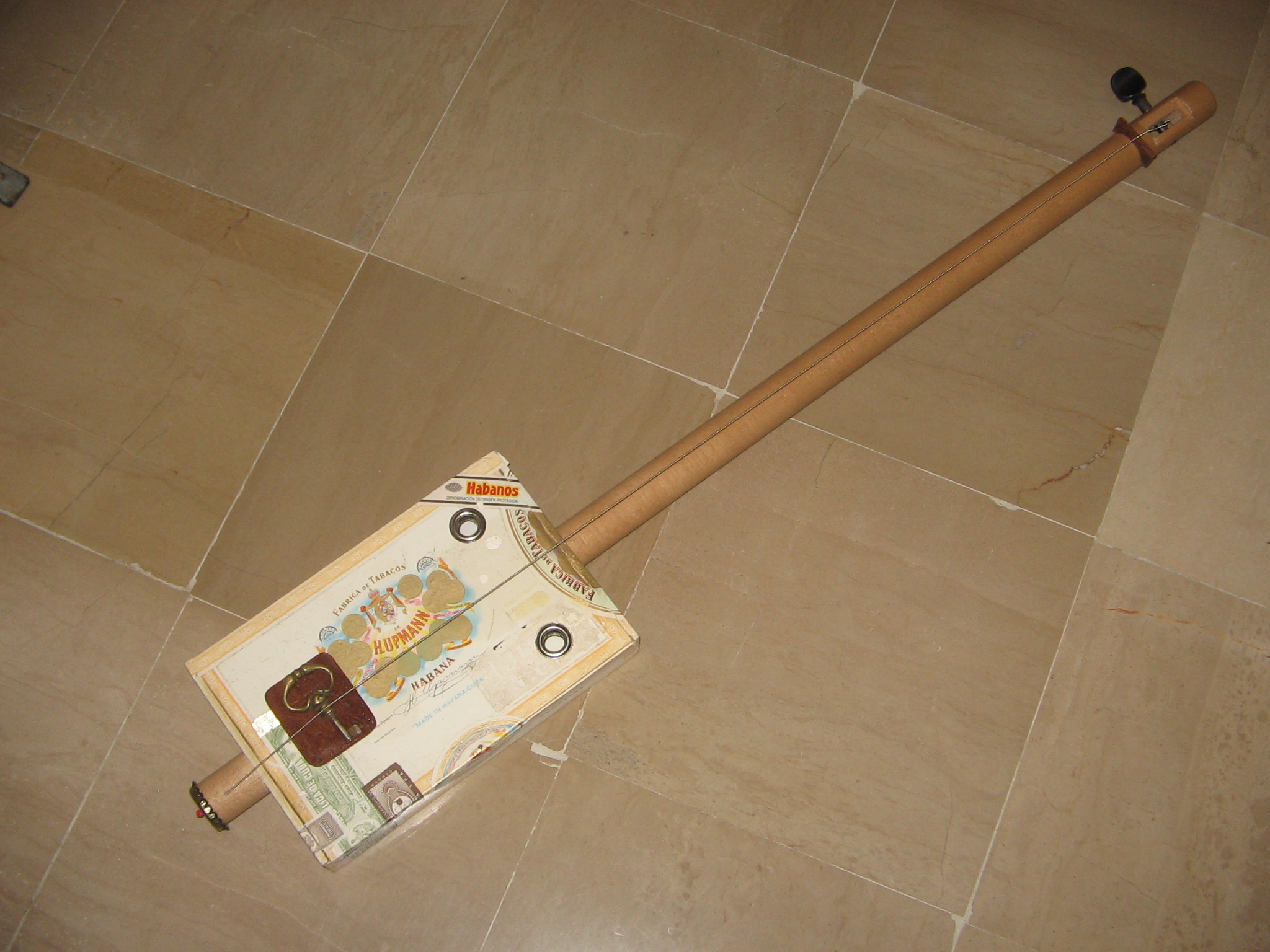 Cigar box guitar, strumento musicale rudimentale, appartenente alla famiglia dei cordofoni. Lo strumento veniva costruito con mezzi di fortuna, come scatole di sigari appunto, dai braccianti afroamericani negli stati meridionali degli USA. Questi particolari oggetti si diffusero a partire dal 1800, quando i sigari iniziarono ad essere commercializzati nelle scatole piuttosto che nei barili. Esistono parecchie varianti dello strumento dipendenti per lo più dai mezzi che si riuscivano a reperire per la costruzione. Venivano costruiti modelli con e senza tasti, e da una a fino a un massimo di sei corde. La variante più diffusa è quella a 3 corde con tasti, la più rudimentale a una corda e senza tasti. Spesso quest'ultima era costituita da un legno di scopa come manico. Fa parte degli strumenti che diede origine al delta blues e le tecniche più usate (soprattutto nella variante senza tasti) sono lo slap e lo slide (o bottleneck). L'accordatura dello strumento segue solitamente le ultime corde della chitarra ma più spesso le accordature aperte più adatte alla tecnica bottleneck. Questo strumento è stato realizzato da Liuteria Elettrica di Torino con una scatola di sigari cubani H. UPMANN e un manico di scopa, non ha tasti, ha una sola corda, una vecchia chiave per ponticello e un pirolo di violino per l'accordatura.