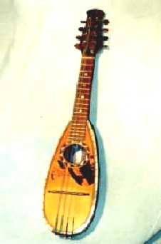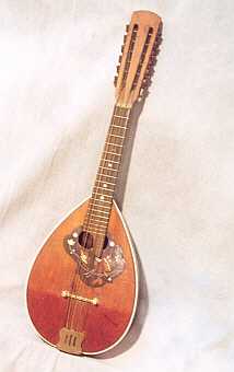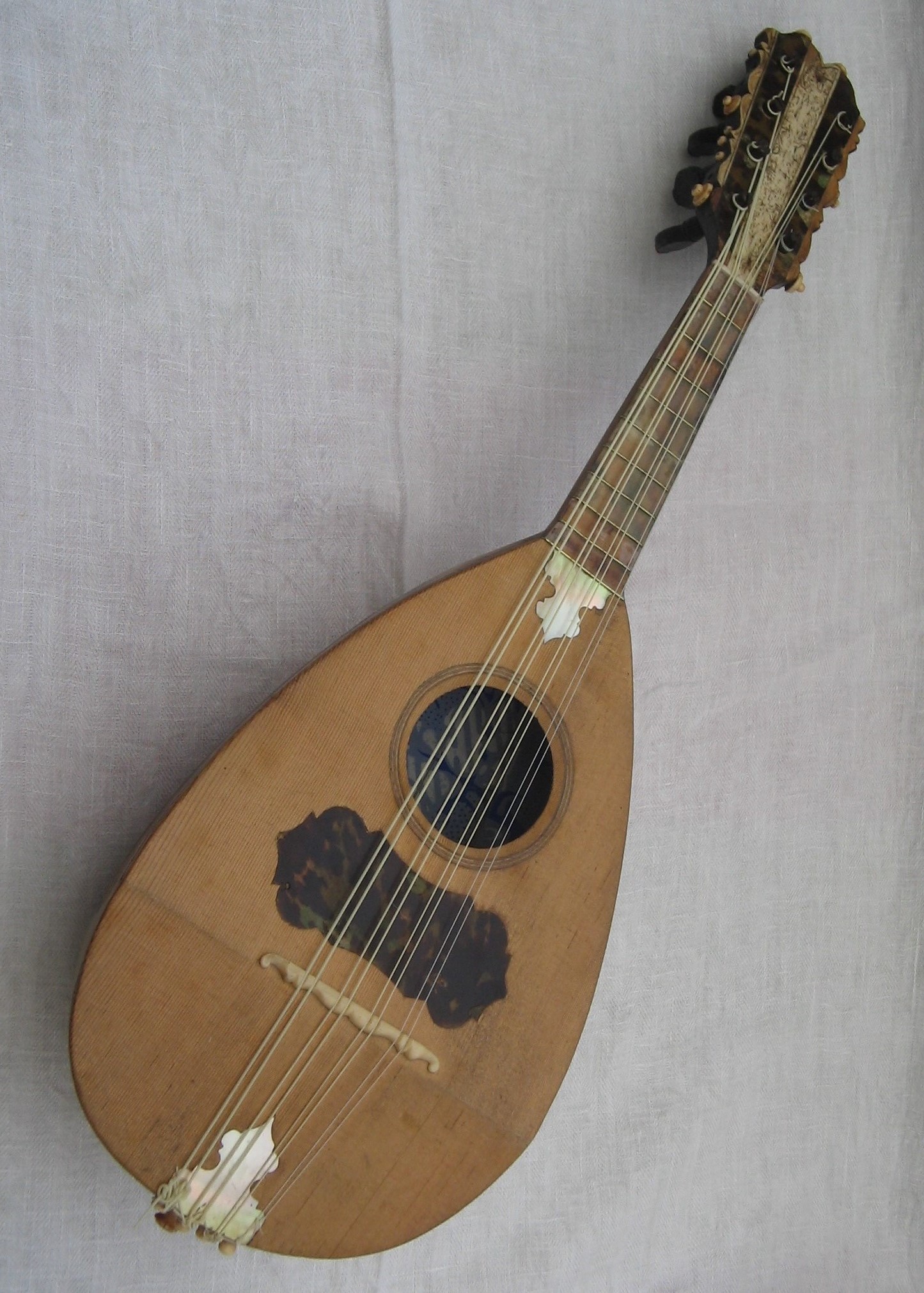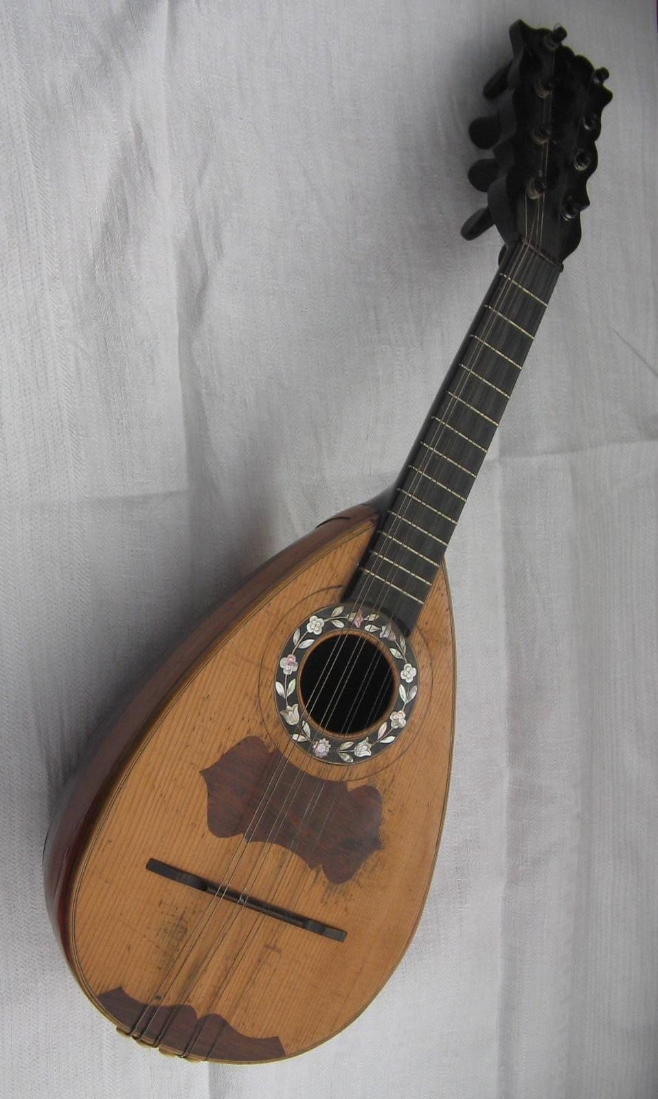 Mandolino-pochette, metà '800, napoletano, anonimo. Lo strumento è formato da un guscio, rivestito all'interno da carta viola, formato da 13 doghe in noce. La tavola, in abete, è contornata da una doppia filettatura nera e da una grossa decorazione in madreperla. Il battipenna è in tartaruga. La buca, tonda, è contornata da due doppie filettature e da fregi in madreperla. Il manico e i due piani esterni della paletta sono in noce, il capotasto in avorio e la meccanica è dotata di farfalle in corno..