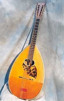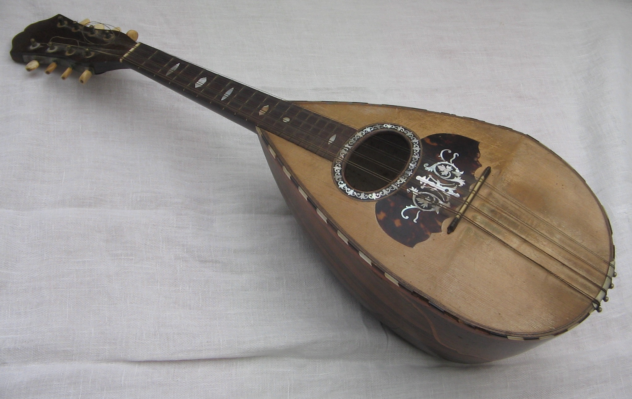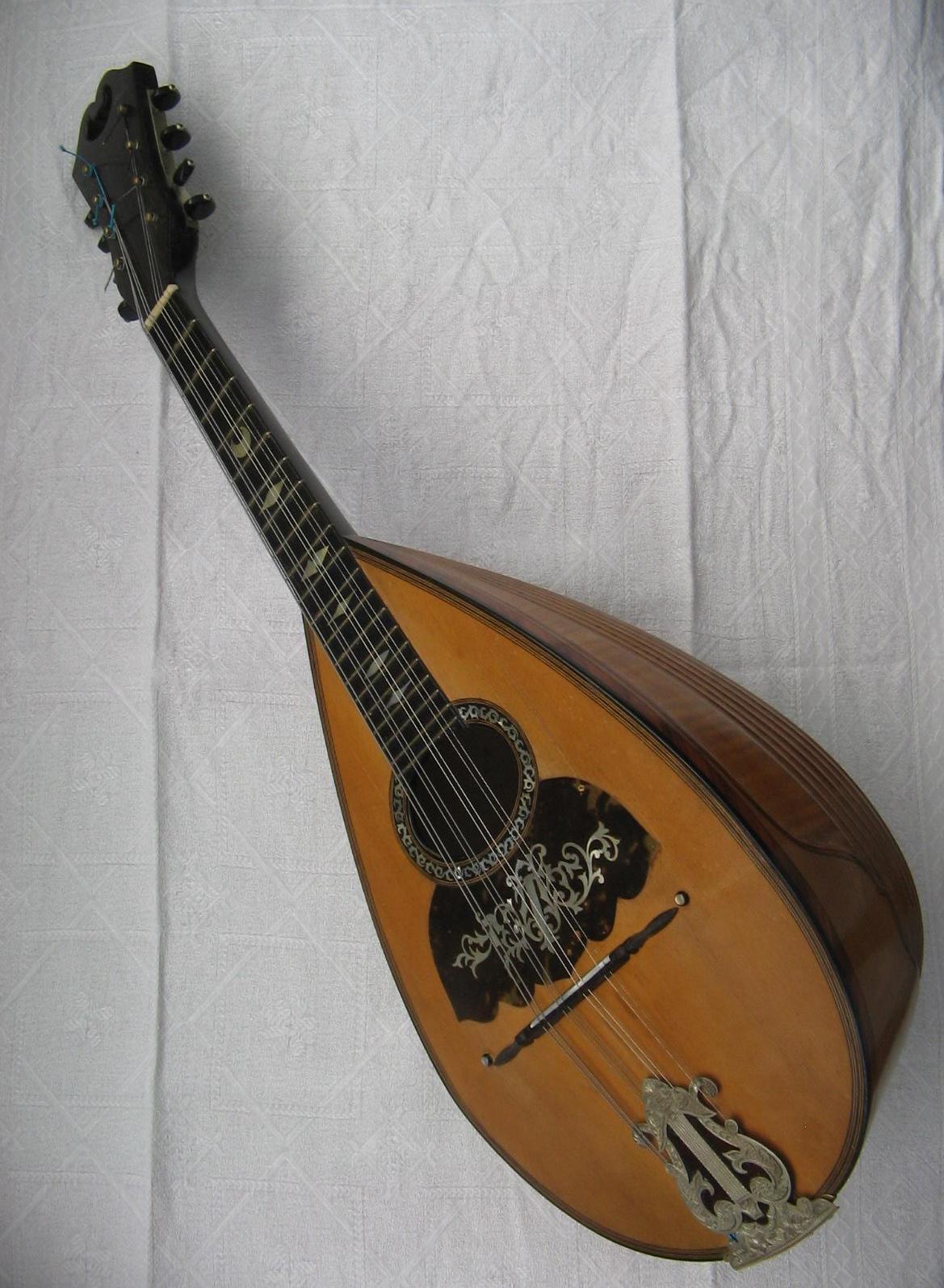 Mandola napoletana, fine XIX sec., molto probabilmente di manifattura Vinaccia, paletta in noce, piroli a vite in avorio, tastiera e ponticello in ebano, fondo a 31 doghe in palissandro, foro ovale, tavola in abete con piastra e bordi in tartaruga e madreperla.