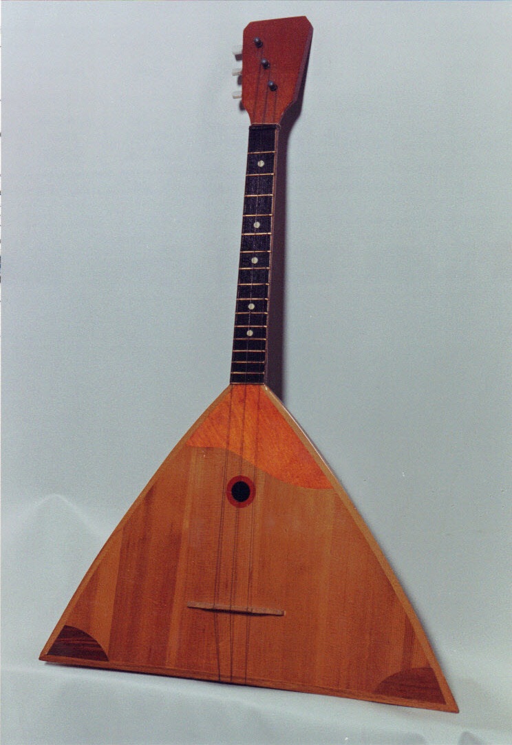 Balalaika russa, XX secolo. Questo strumento, suonabile sia a pizzico che a plettro, dalla tipica forma triangolare, è armato con tre corde accordate la prime due sul La e la terza sul Re. La lunghezza totale è 685 mm. il manico è lungo 265 mm. e presenta 16 tasti metallici, il piano armonico, composto di varie doghe di abete e da inserti di altri legni, presenta una larghezza di 432 mm. mentre il fondo è costituito da 7 doghe. La meccanica mostra farfalle di plastica. Il cartiglio interno è in cirillico e testimonia la provenienza russa dello strumento.