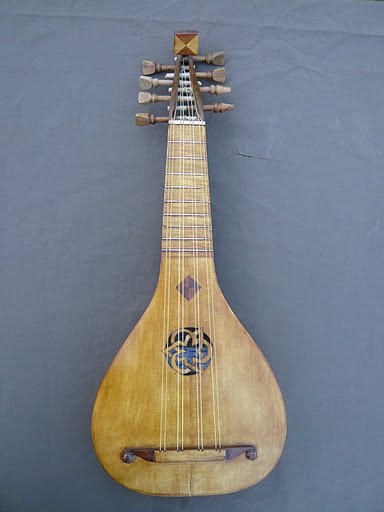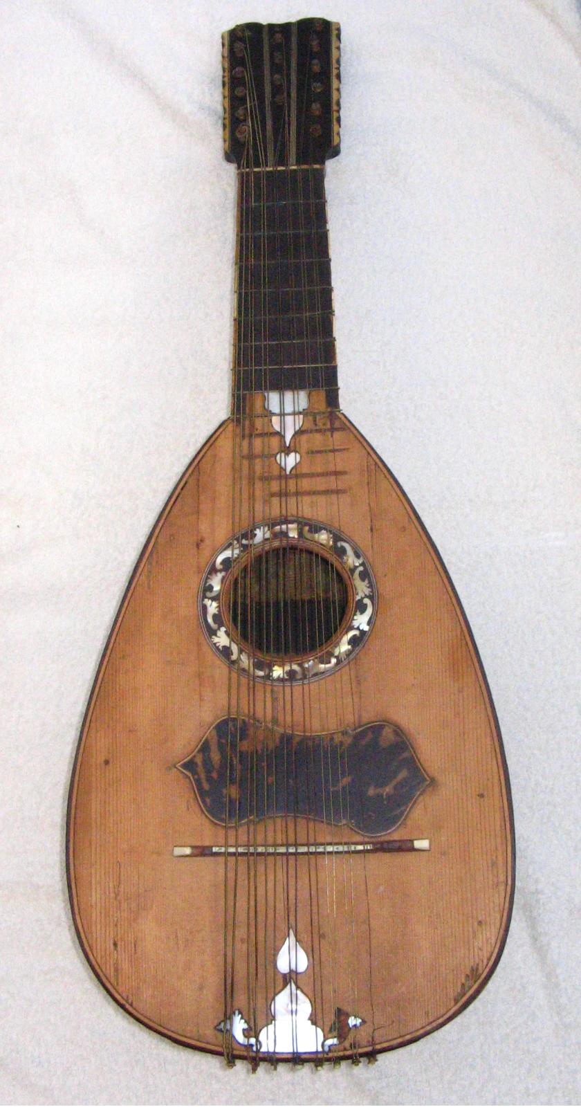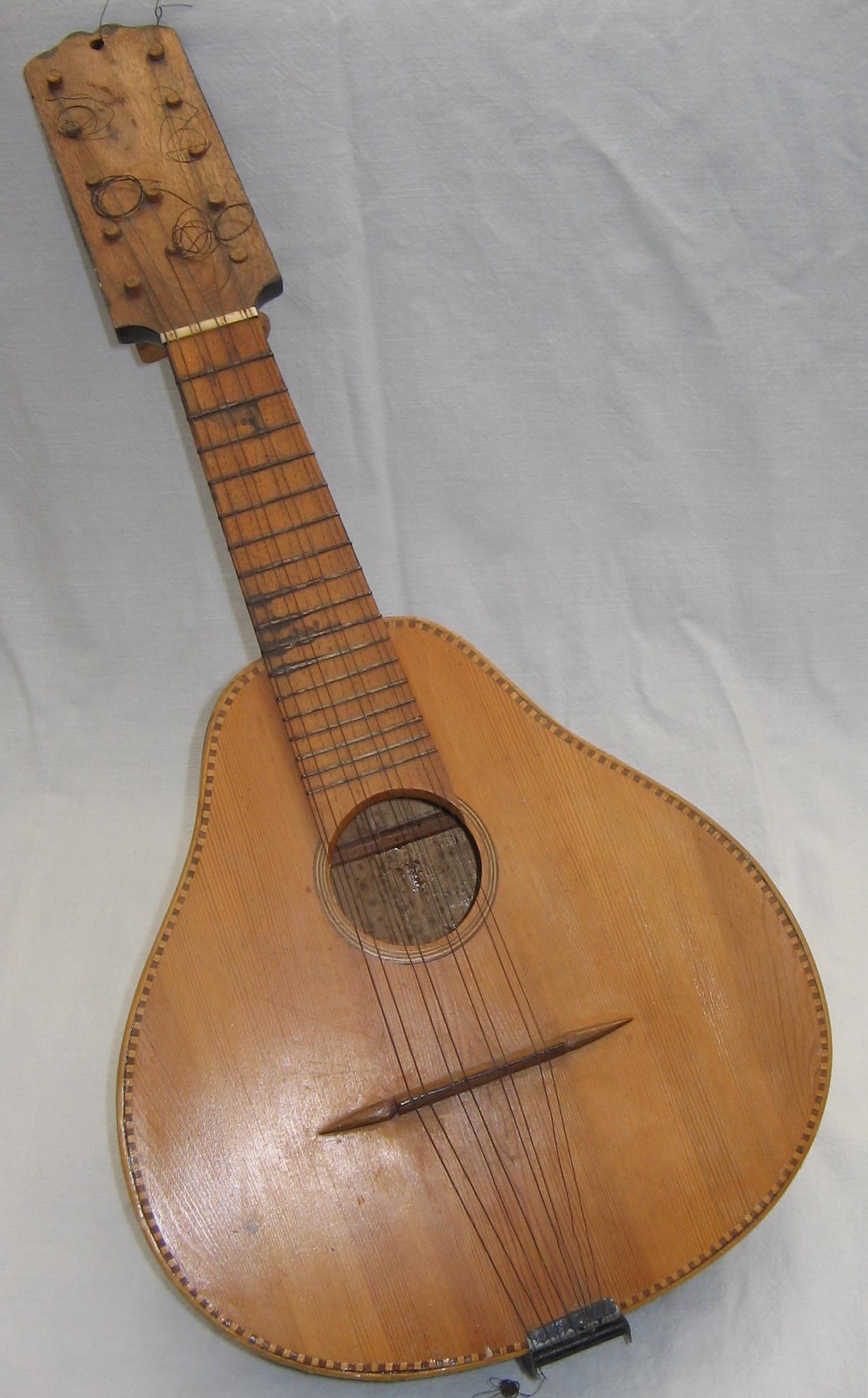 Bandurria spagnola anonima, databile tra la fine del XIX e l’inizio del XX secolo. Piano armonico piriforme in abete contornato da intarsi quadrati di ebano e abete, buca tonda contornata da quattro filettature in ebano. Fondo, fasce, paletta e manico in palissandro (?) dipinto in nero, tastiera in palissandro con 17 tasti metallici, capotasto in osso, ponticello in legno. Lo strumento monta quattro cori da tre corde metalliche, i 12 piroli sono in legno chiaro (due rotti).