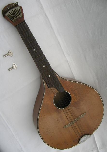 Mandolino a fondo piatto, XX sec., costruttore Frambach, Liegi, paletta e tastiera in noce, meccanica a piroli di bachelite, fondo a 6 fasce in mogano e 6 in legno di pero filettate in ebano, piccolo foro armonico ovale, tavola in abete filettato, piastra in ebano e madreperla.