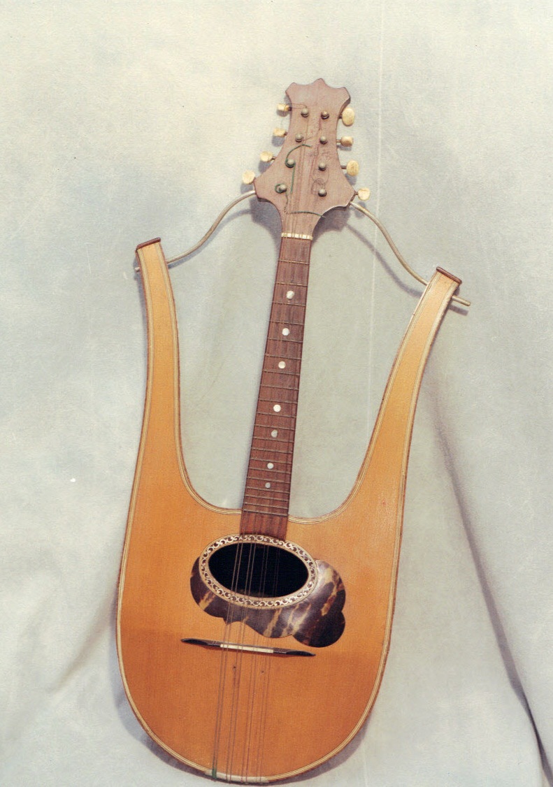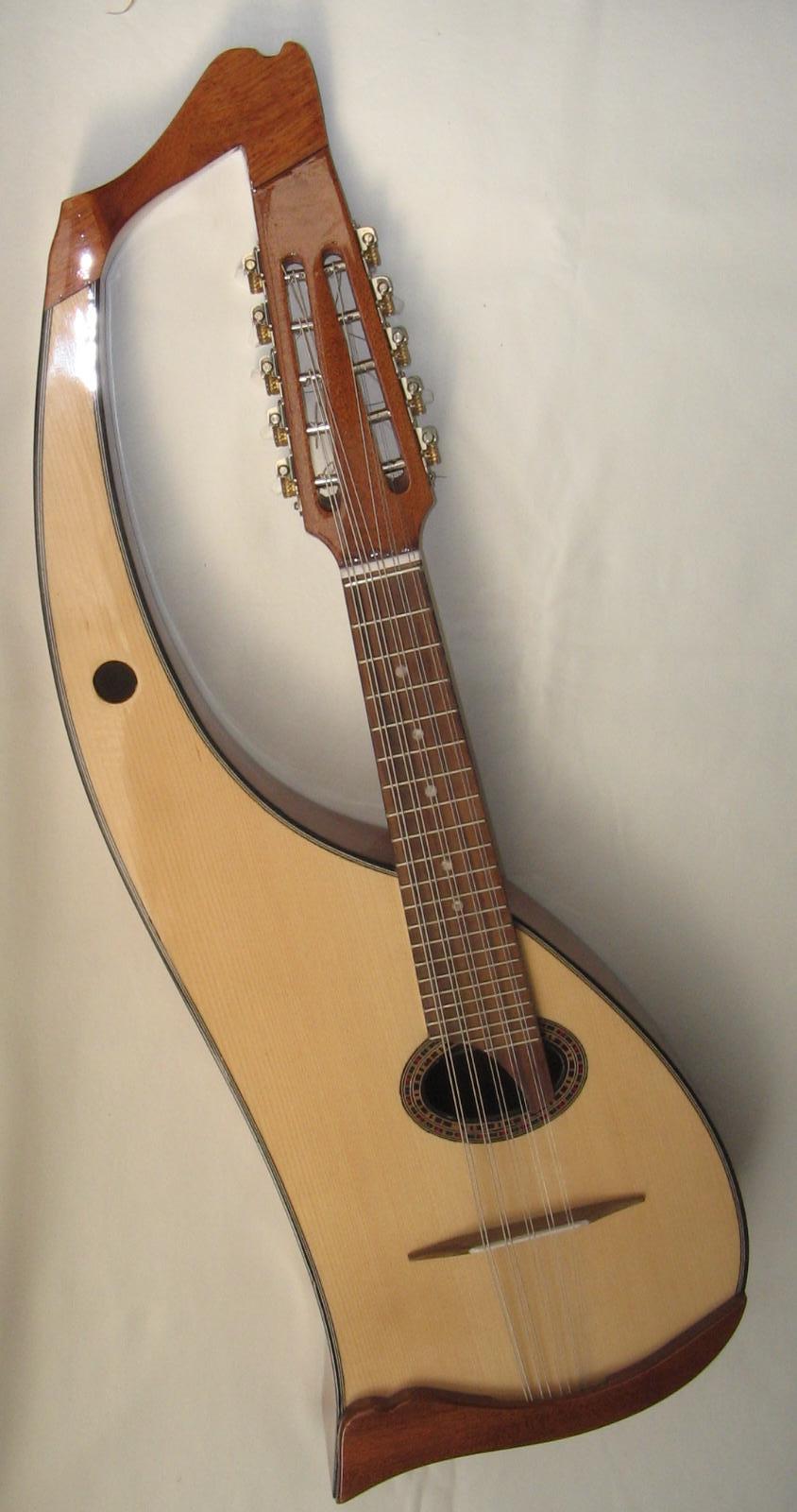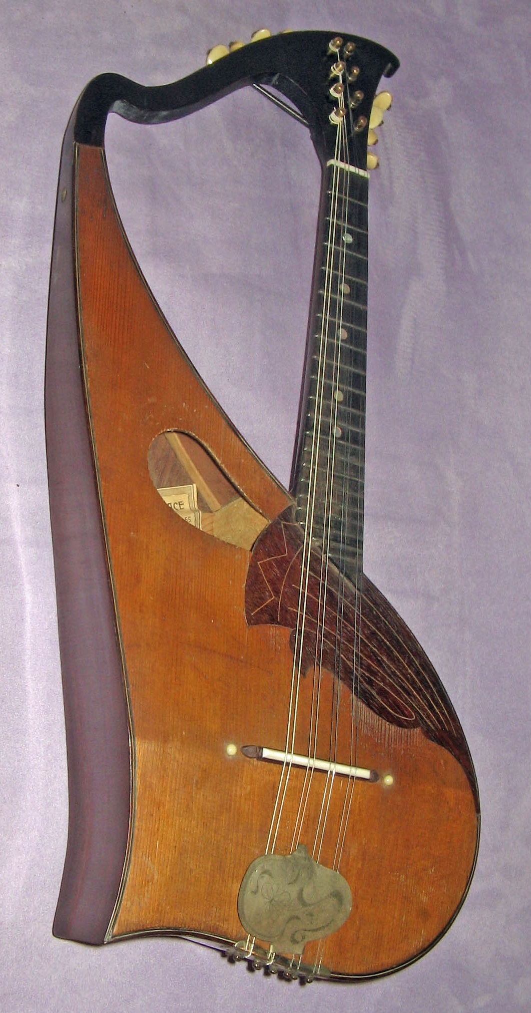 Plettrharpa brevettata e costruita da Nicola Maria Calace nell’agosto 1903 a Napoli. Questo strumento è una sorta di mandolino asimmetrico con un arco leggermente angolato alla sinistra della tastiera che congiunge la cassa alla paletta e lo fa assomigliare ad un’arpa liberty. La ragione della sua invenzione, così come della Mandolyra brevettata dal fratello Raffaele qualche anno prima, è da ricercarsi nell' enorme successo del mandolino nella canzone napoletana di quell'epoca. Un fatto indubbiamente molto positivo ma con un risvolto negativo: il mandolino napoletano ormai era etichettato come strumento troppo popolare e quindi non più uno strumento adatto all'alta borghesia che fino a qualche anno prima era appassionata dello strumento (anche la regina Margherita era un'abile mandolinista!). il fondo è piatto, in noce, mentre la tavola è in abete con filettature in ebano e avorio e un battipenna in palissandro a disegni liberty. La buca è oblunga e asimmetrica, la tastiera in ebano con ventidue tasti metallici e, sulla paletta vi è una meccanica con otto piroli a vite con testina piatta in osso. L’etichetta interna recita: NICOLA M.ria CALACE / NAPOLI / Via S. Anna de’ Lombardi, 54 . 55 / 1903 (firma autografa) Nicola Calace mentre sull’arco vi è la scritta: Brevetto / No 173.